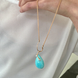 A stunning, pear shaped, smooth turquoise (origin Arizona) is delicately held by a forged 18K rose gold and diamond bail.