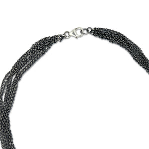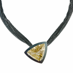Oxidized sterling silver, triangular faceted rutilated quartz (30.47 cts), 7 strands of cable sterling silver chain, 16.5" length, oxidized, pendant dimensions 31 x 31 mm.
