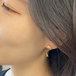 Glossy yellow gold drop earrings handcrafted to resemble a billowing ribbon.