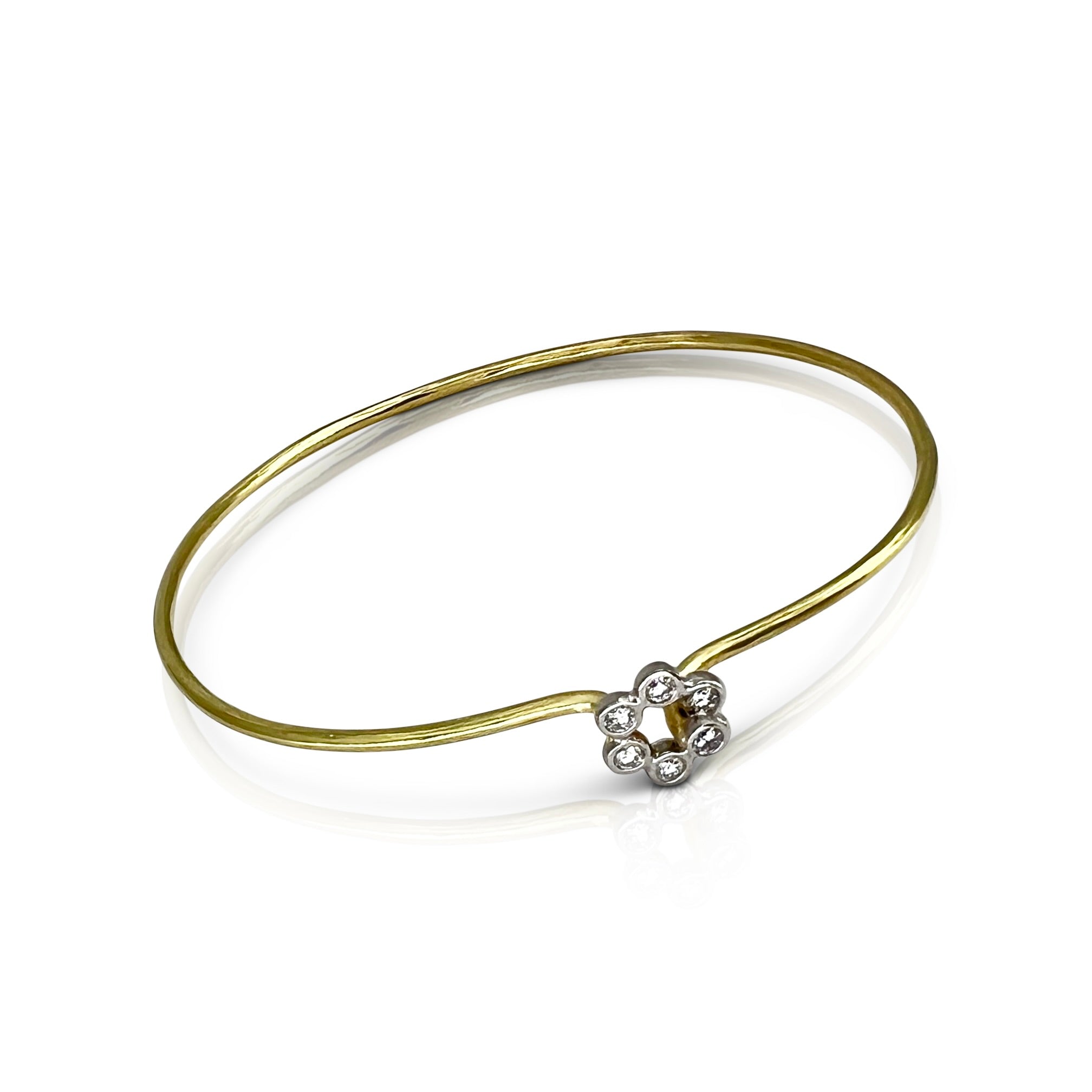 This elegant bracelet features a slender 18K yellow gold bangle secured by a platinum wreath clasp. The wreath is adorned with diamonds totaling 0.17 carats, adding a subtle sparkle to this refined piece.