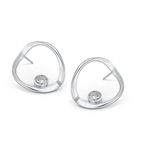 Taking our V hoop to an elegant level, we have turned this piece into an affordable, versatile setting for diamonds of almost any size. A subtle hammered silver with a rhodium finish gives you a platinum look without the weight or cost of platinum. These earrings sit gracefully on the ear and the angle of the setting insures that the stone is always facing forward.