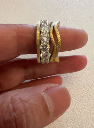 Two gentle curves come together and are connected at four points. This is a great stacking ring. It has a high profile so it matches well with those high profile rings like anniversary bands