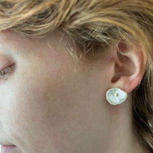Keshi freshwater pearls, 18K yellow gold setting and post. Ear nut is sterling with vermeil gold finish. One earring is slightly different than the other. Approx. diameter 16mm x 14mm