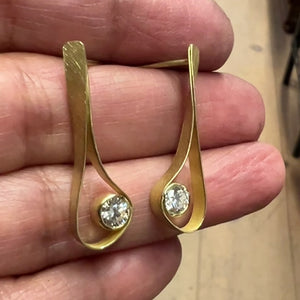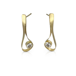 A graceful twist in the ribbon-like gold strip makes the diamonds face forward so you can fully appreciate their beauty. There is a right and a left earring.