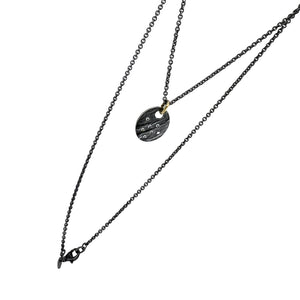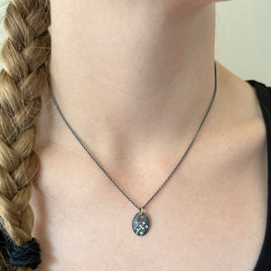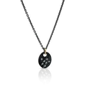 Sterling silver, the oval disc itself is 15mm x 12mm, 0.07 ct tw (7) diamonds, 18KY gold bail, 16" or 18" length, 1.7 mm cable chain, oxidized.
