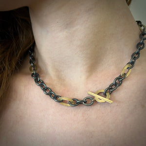 A rugged, flat, oval silver link is juxtaposed with an unusual flattened textured gold link to give you this throw-on-and-go necklace.