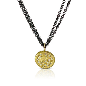 18K yellow gold with 17 diamonds, 0.15 ct tw, G, VS quality, 18.5mm x 13mm, double oxidized sterling silver cable chain available in 16 and 18". Other lengths can be customized. Please inquire.