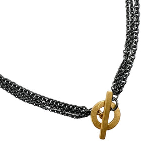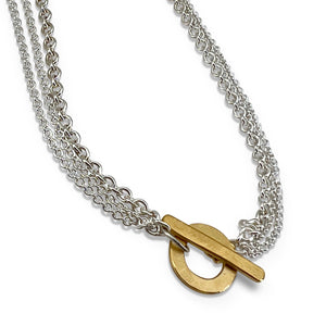 Three sterling cable chains of varying sizes with a hand forged, sterling silver/Vermeilfinish, toggle clasp, 16" length.