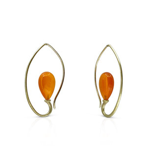 A small flame is held in a yellow gold perimeter in this inverted hoop. The rich gold is a perfect compliment to the fiery orange of the stone.