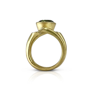 A burst of four diamonds surrounds a fiery, beautifully cut, green spinel, set in rich yellow gold.