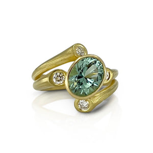 18K gold ring with four diamonds, .38 ct tw, F, VS quality, 3.5 ct oval mint green spinel that ranges in color from a mint green to a deeper green depending on the light. The ring dimensions are 18mm front x 4mm back. Size 6.75. Sizing is possible, please inquire.