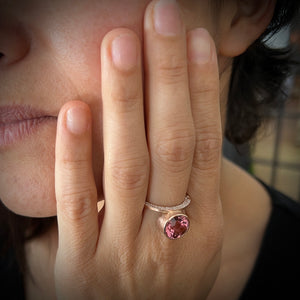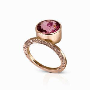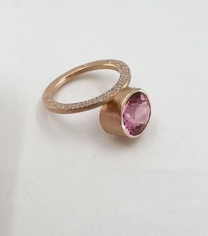 Glimmering diamonds dance across one side of the ring, tempting with their light. The other side holds a bold and beautiful pink tourmaline encased in 18K pink gold - a sight of luxe elegance!