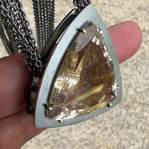 Oxidized sterling silver, triangular faceted rutilated quartz (30.47 cts), 7 strands of cable sterling silver chain, 16.5" length, oxidized, pendant dimensions 31 x 31 mm.
