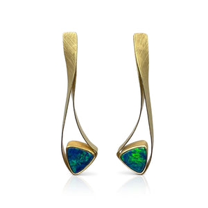 A graceful twist in the ribbon-like gold strip makes the opals face forward so you can fully appreciate their beauty.