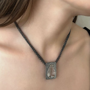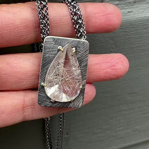 Oxidized sterling silver, 18K yellow gold, rutilated quartz (17.21 cts), 3 strands of cable sterling silver chain in varying sizes, pendant dimensions are 30 x 20 x 8mm, large lobster clasp, 16" length.