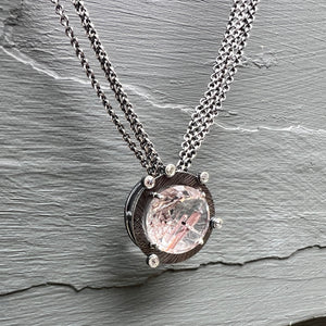 Oxidized sterling silver, rutilated quartz (8.49 cts), 5 single cut diamonds(.175 cts), 3 strands of cable sterling silver chain, pendant diameter is 21/22mm x 6mm, large lobster clasp, 16" length.
