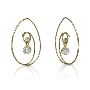 The stones are held in the center of the hoop and move freely, inviting light to radiate from each facet. This is further enhanced by the orientation of the center element. There is a right and a left earring so the stones face forward when worn.