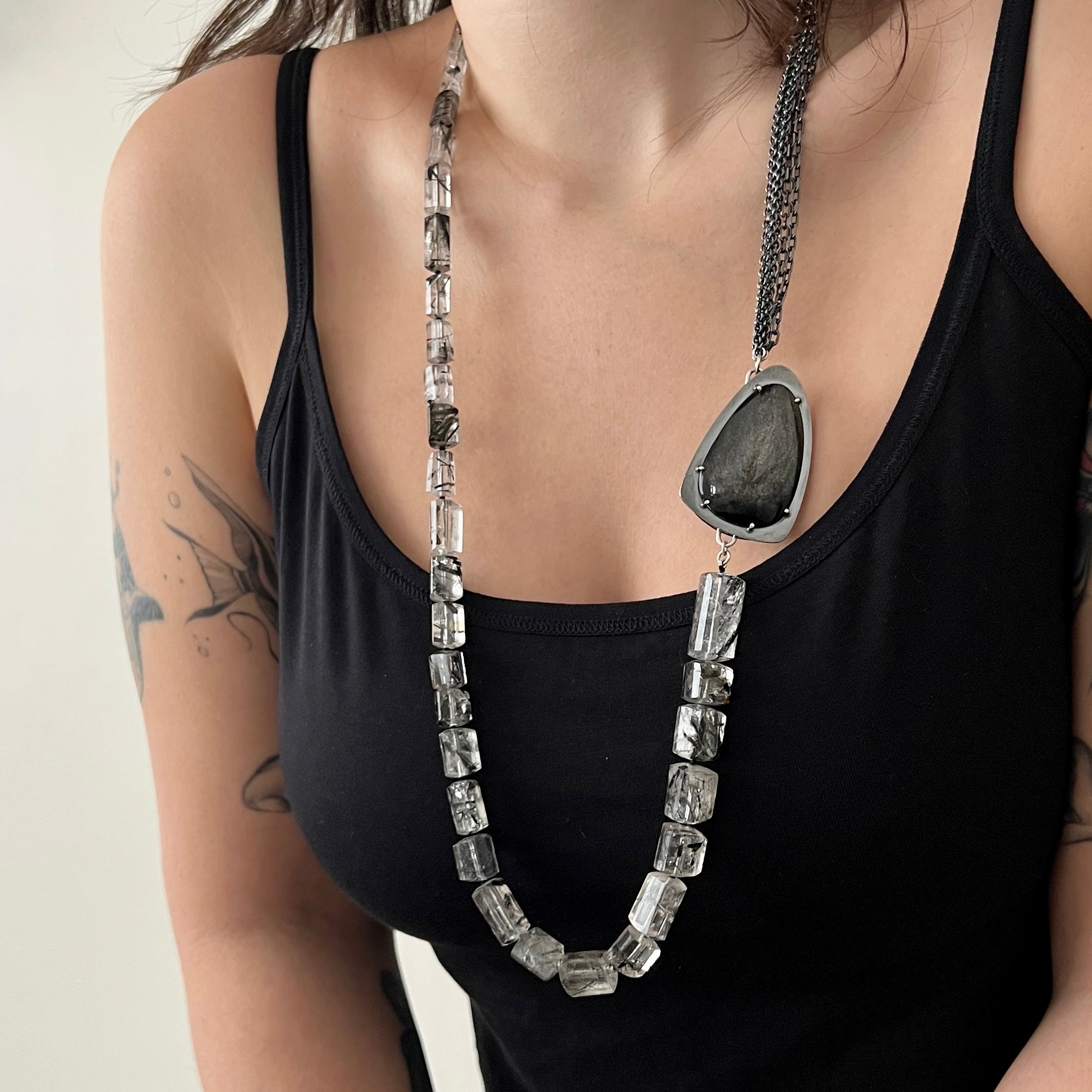 This striking necklace brings together rutilated quartz, shimmering volcanic rock, and oxidized sterling silver for a bold, one-of-a-kind look. The interplay of black and white tones creates visual interest from every angle. Perfect for adding an artistic edge to any outfit.