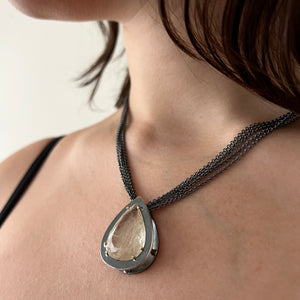 Delicate gold rutiles dance through this pear-shaped rutilated quartz. Set in Ayesha's signature frame with 18K yellow gold prongs, it hangs gracefully from a multi-strand sterling chain. A striking yet refined piece that balances boldness with understated elegance.